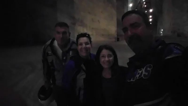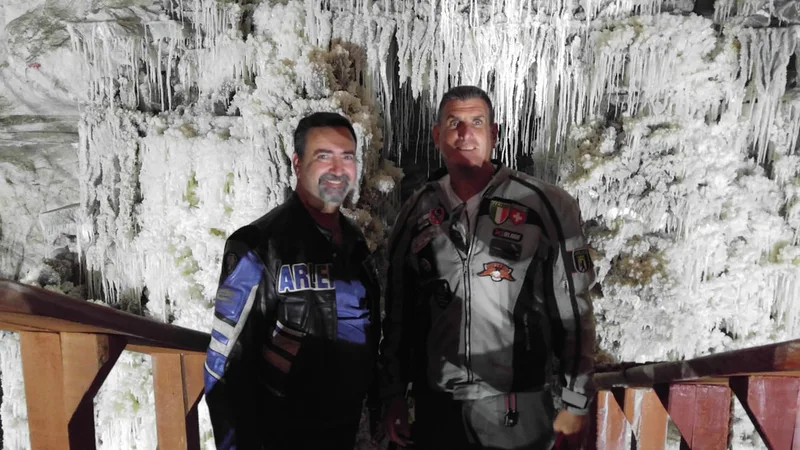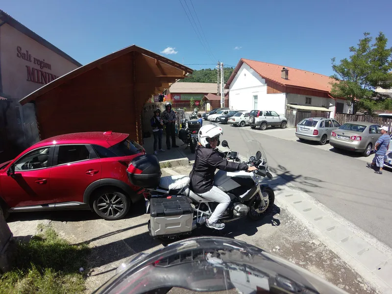 We received the motorcycles, mounted the equipment on them, and left Bucharest. Destination: Brasov, via the Slanic-Prahova Salt Mines. The GPS took us through very nice country roads, in an area of Romania which is still quite plain, until Slanic, where we had the task to find the mine and go in.