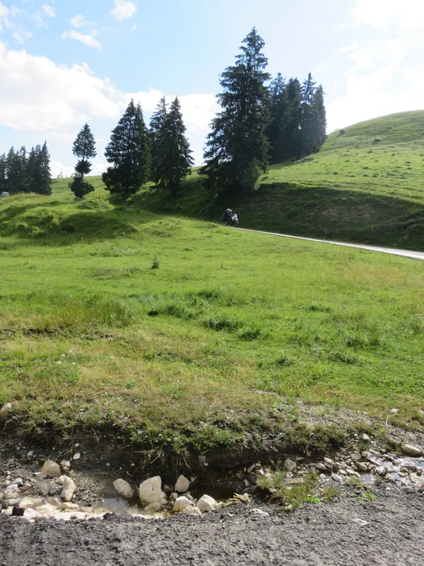 The road went through beautiful green fields. Its width permitted one vehicle only, and when another vehicle came in the other direction, someone had to stop at the roadside. With motorcycles, everything was easier.