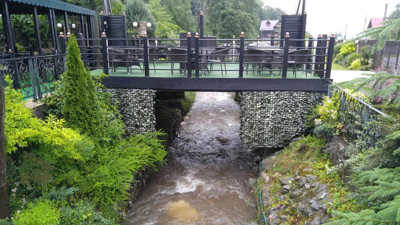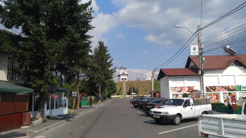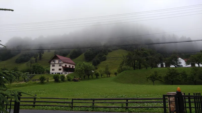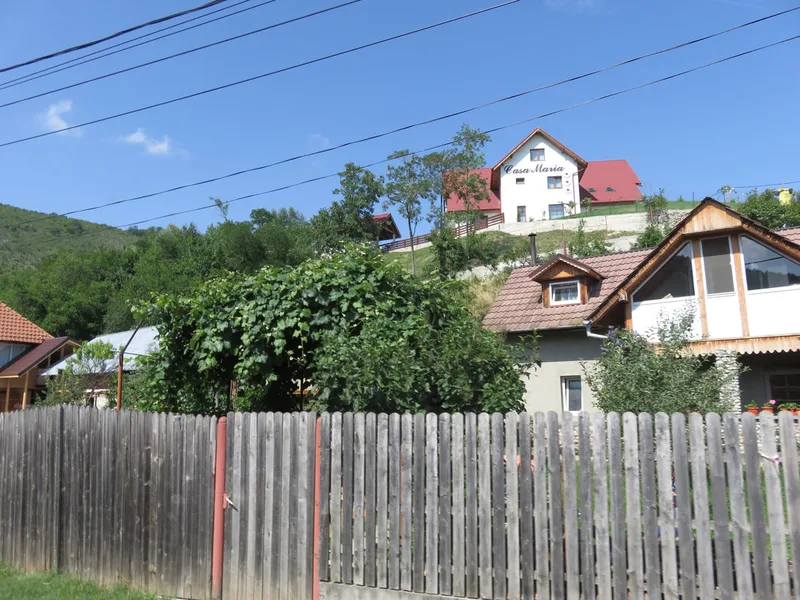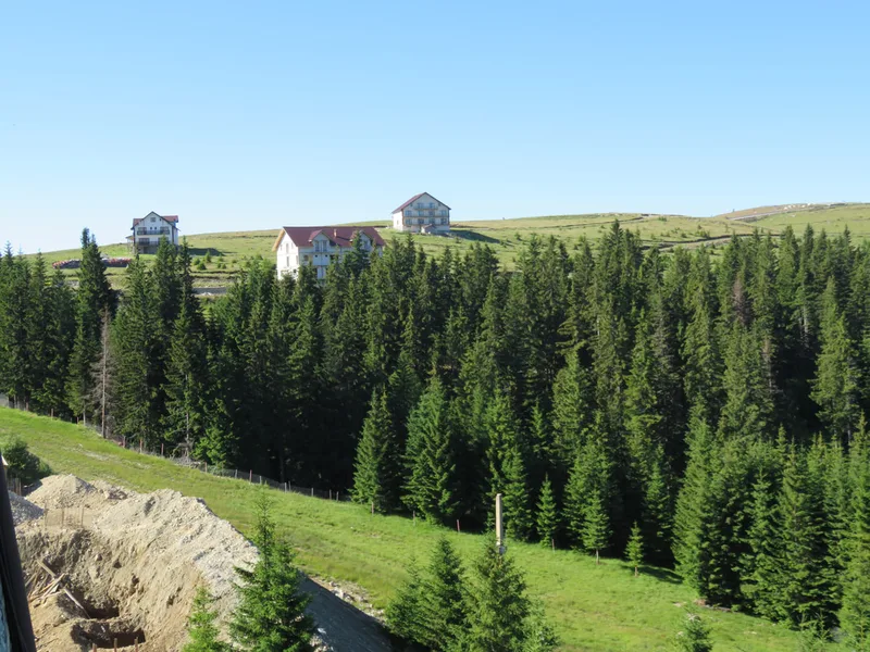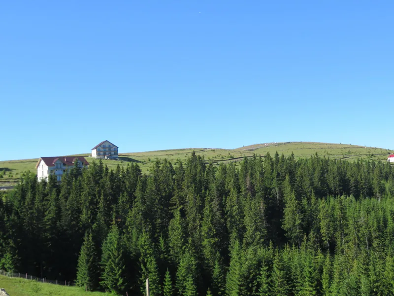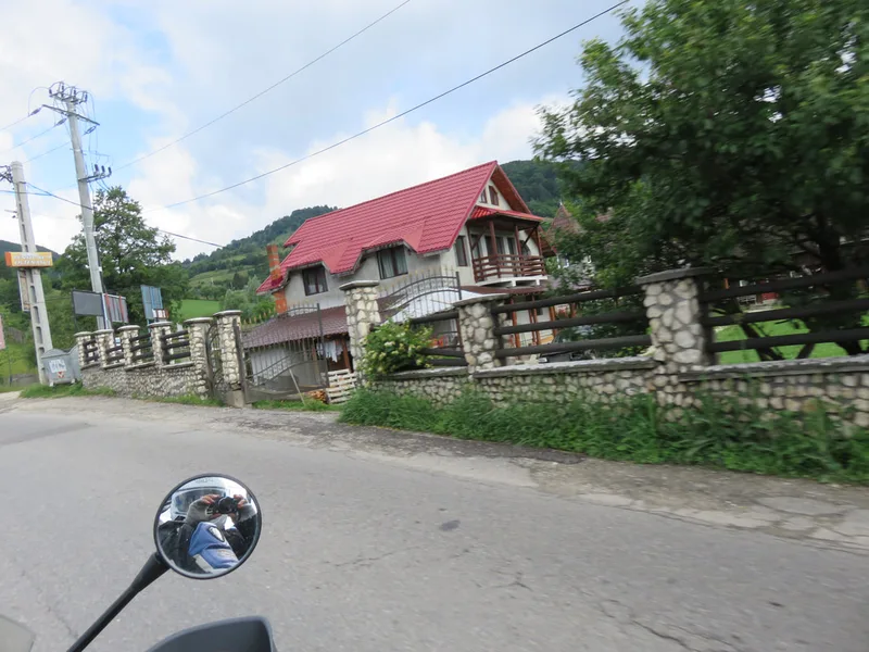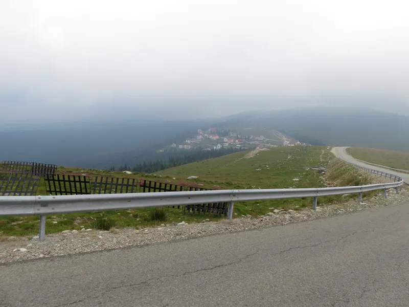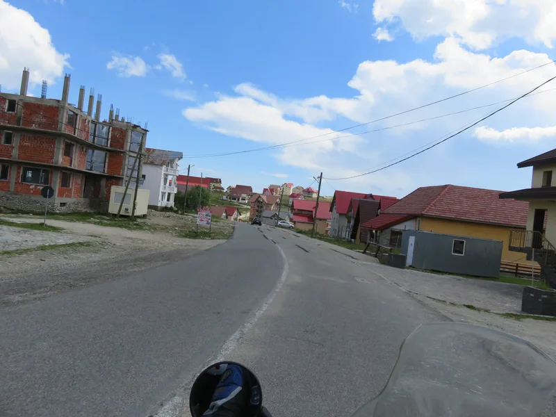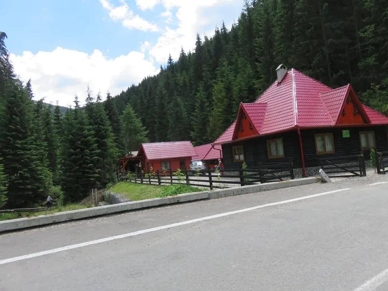 Well, we are over Urdele Pass, and now we begin to smoothly go down. After some kilometers, we begin to see small houses in Swiss style. That's the Ranca Resort, our destination for today. Our hotel, Pension Valea Mariei, is one of the traditional hotels there.
