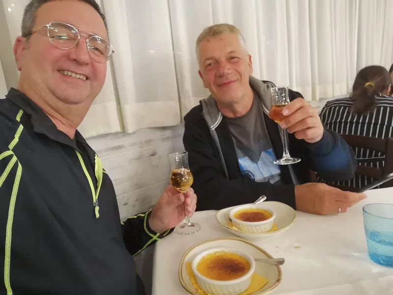 Well, the meal began with a pizza for each and a bottle of great Italian red wine, and finished with a Creme Catalan accompanied by a glass of Grappa. At the end we were very full, very satisfied, and very dizzy. It was a great luck that we could call Oberdan and ask him to take us back to the hotel, since I doubt we would be able to drive back to there...