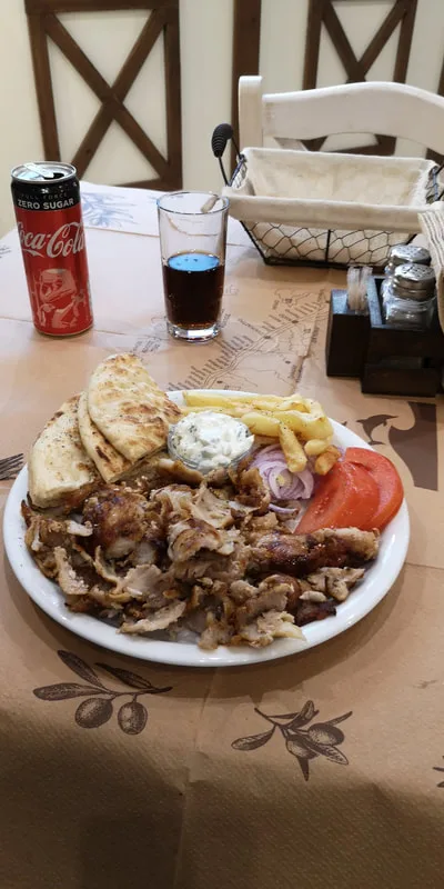 Probably due to initial shock, and since I would have another night to go there again if I wanted, I decided to go for the well known and asked for a Gyros. The Gyros is what the Israelis know as Shwarma, very common in Israel. I got a gorgeous plate with the Gyros, some french fries, Tzaziki (the greek salad made of yogurt with cucumber and some other things), tomatoes, purple onions and pita breads. It was perfect, one of the best portions of this food that I have ever received.