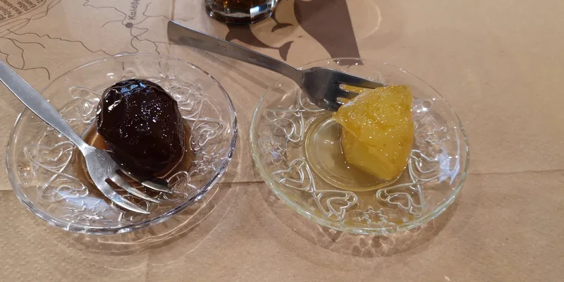 For dessert, the hostess suggested a typical Greek compote, and I accepted it. I received two plates, one with a preserved tangerine (or one of the tangerine genres, that they call pergamonde), and the second with a conserve of plum - both of them seemed to have come directly from heaven to me.
