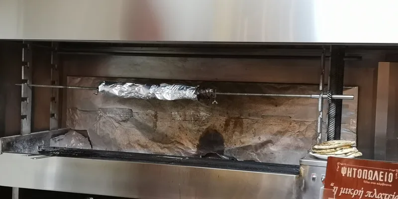 The Kontosouvli is a very interesting Greek Typical plate. What we see here is the Peloponnese version of it. We can see it in a lot of formats in Greece, made from Pork, Beef, Lamb or Chicken, but in the Peloponnese the option is Pork or Chicken. They cut the meat in large "balls", wrap each piece in aluminum foil, and stick it in a barbecue stick over the fire. The meet cooks in there for a long time, and as people order it, they remove the balls, one by one, and serve it cut in smaller pieces. While it is over the fire, it looks like in the first picture, on the plate like in the second. Taste of heaven, the meat is tender and juicy.