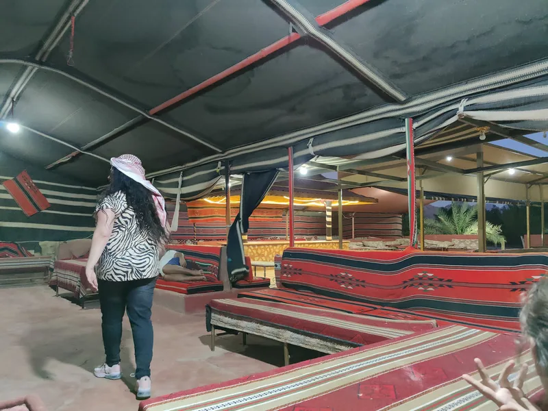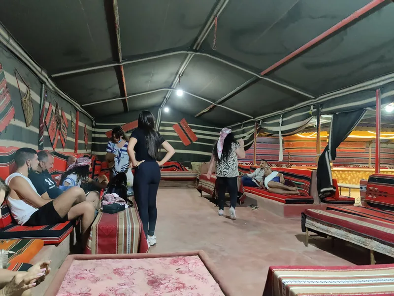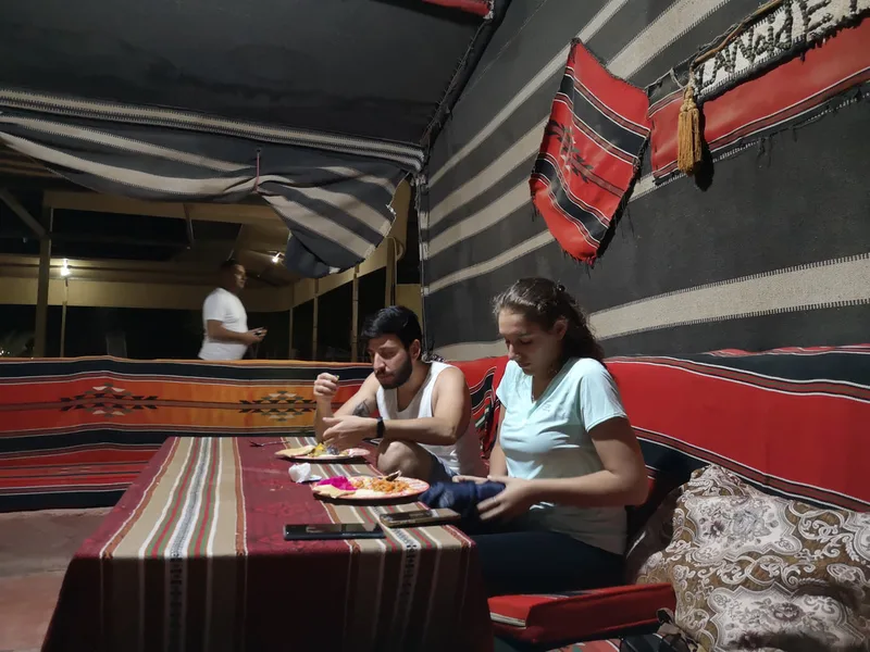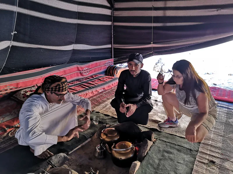 In the middle of the tour, at the middle of the desert, suddenly a bedouin tent, where you can drink tea with the old man sitting there, buy some products, and he also plays and sings bedouin songs to the groups that pass by.