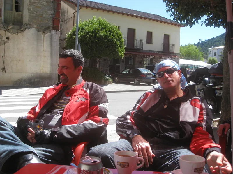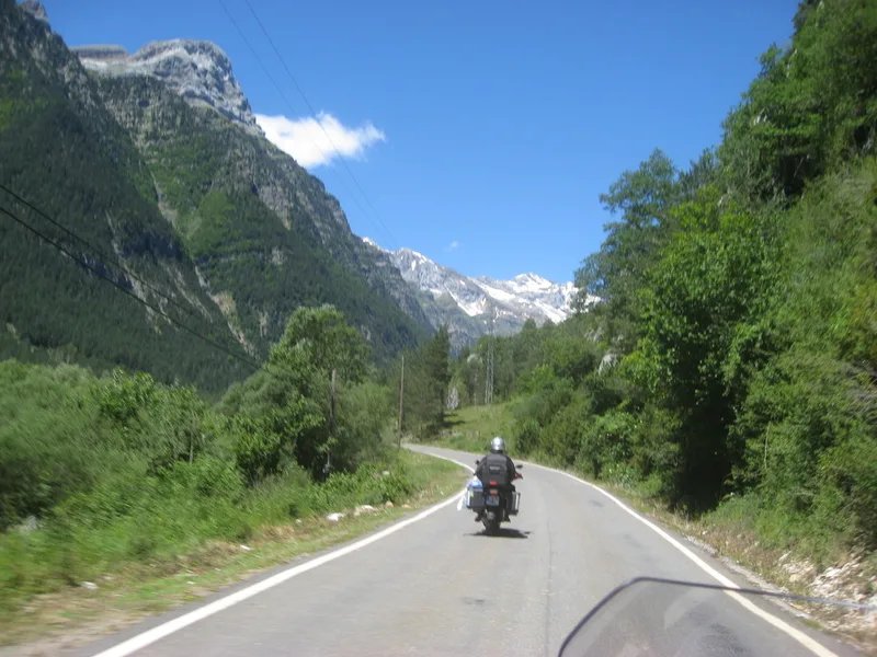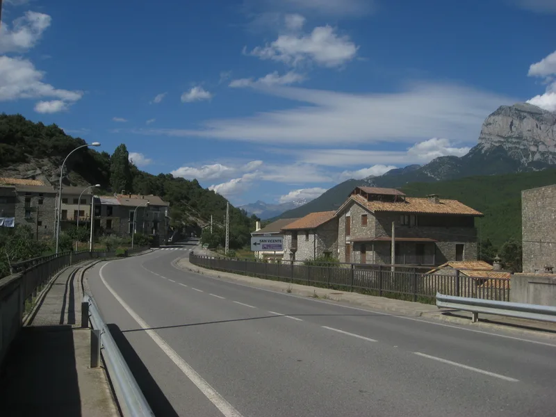 The A-1604 ends in the entry to Boltaña. We sat at Boltaña for a cup of coffee, and there met a couple of dutch people, man and wife. He was riding a BMW K1600GTL, and she was riding a BMW R1200R. They told us they have a motor home with a covered trailer for the bikes, and that they travel with the motor home following the good weather. Where they find good weather they stop at a camping, and spend the next days doing a star-tour with the bikes until either the good roads around are over or the weather becomes bad. Then they move to the next place. They had been travelling like this for a month already, and were still not seeing the end of it.... I must say, this is everything I wished for myself.... but dreams are dreams and we had to go on.