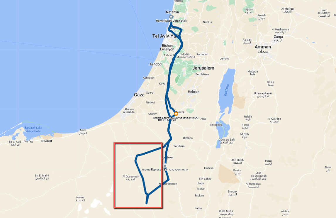 We arrived at the road at Kadesh Barnea/Nitzana in the North and rode around 90-100 Km until Mount Sagi in the South. The main viewpoints are the Kadesh Barnea Viewpoint and the viewpoint in Mount Sagi.