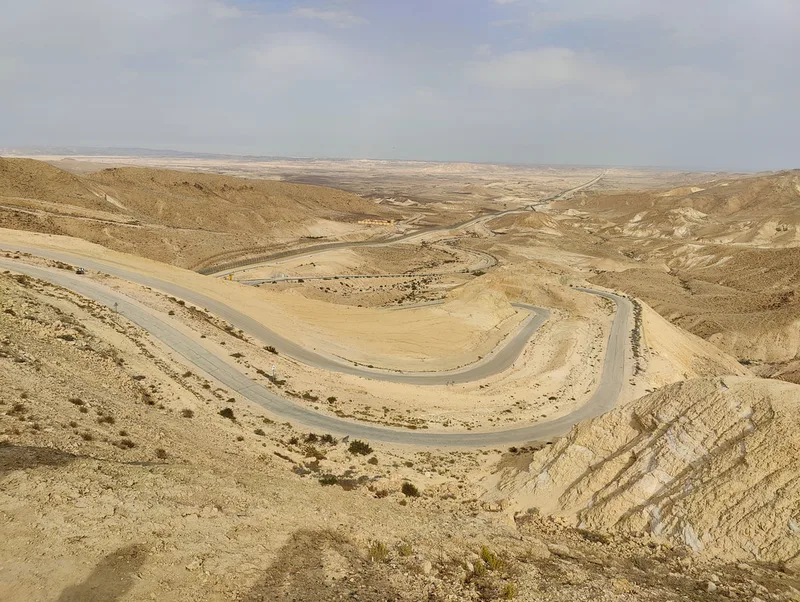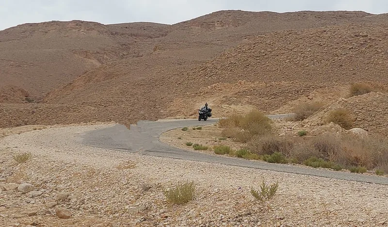 The road is, in summary, very straight, so if you are looking for difficult curves, that's not where to look at. However, the desert beauty is one of the most beautiful in Israel, comparing only to the views of Road 12 to Eilat. In the beginning at the North, there are some nice twists until the Kadesh Barnea viewpoint. Then the road becomes straight and sometimes when we go up one of the mounts (or should I call them dunes?) presents one twist or two, continuing this way until we get near Mount Harif. From Mount Harif to Mount Sagi, it becomes a genuinely nice road to ride, with twists, uphill and downhill slopes, in summary, what a motorcyclist can hope for.