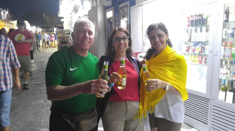 Just as in Super Paradise, nudists (most of them) are already far out of there. All we found was a group of 4-8 old nudists, probably to old to change their costumes and find another beach. So they seat there at one of the extremes of the beach and nobody bothers them. At the rest of the beach, young people, tourists from all around the world, and clubs - at least two of them (I think three). We were in the biggest one, got our chairs in the seashore, and enjoyed for around two hours. At the background, music from the club and a guy shouting at the microphone with the music. Only when we left we saw that the guy was a Brazilian dancer, that together with another dancer (a gorgeous girl) taught all the people around how to dance that music. In two seconds Louiza and Lily were there in the group dancing, and getting free-shots after every 3-4 songs.