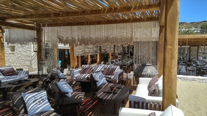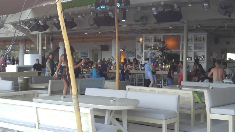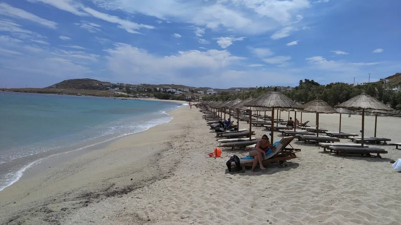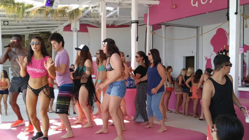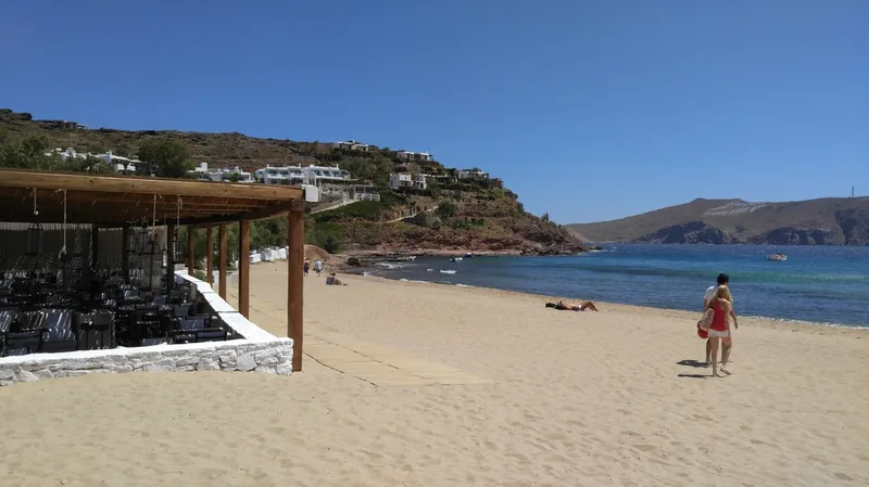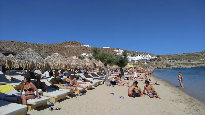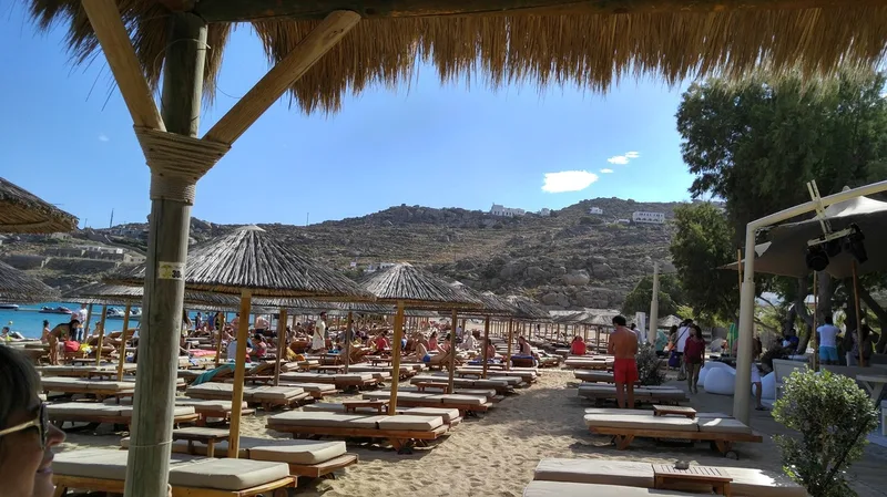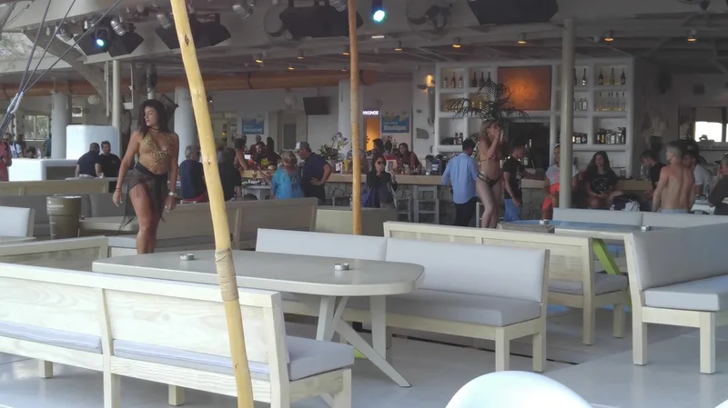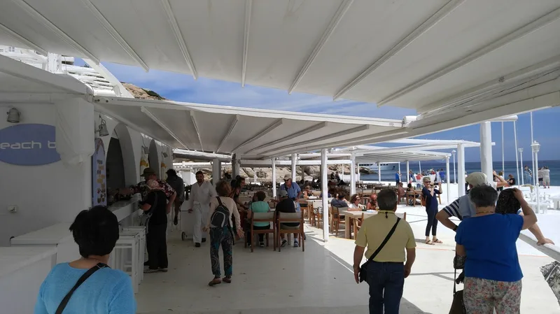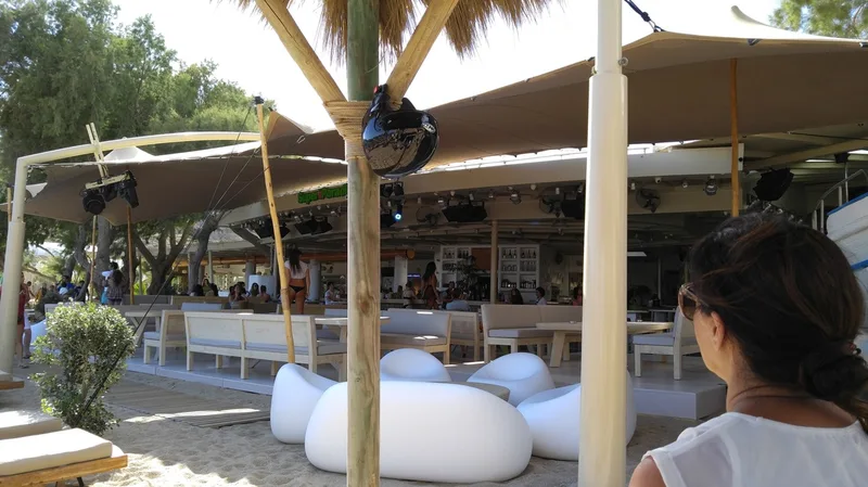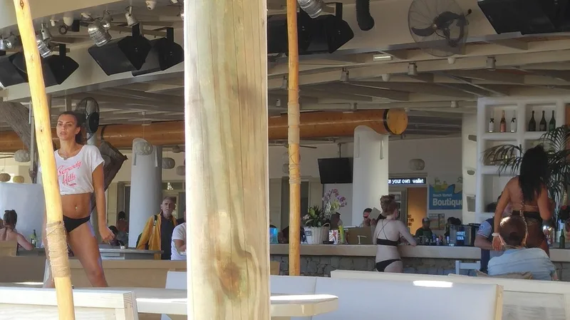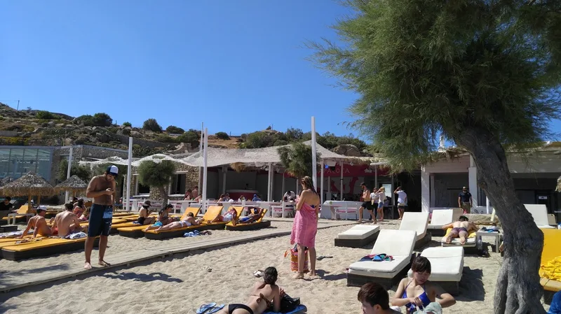Nowadays, the nudists have gone looking to other places calmer than Super Paradise Beach, and the beach was taken by a big bar and dancing club. The club is just behind the chairs and umbrellas at the seashore, there is constant very loud music, and two girls that dance on a platform.