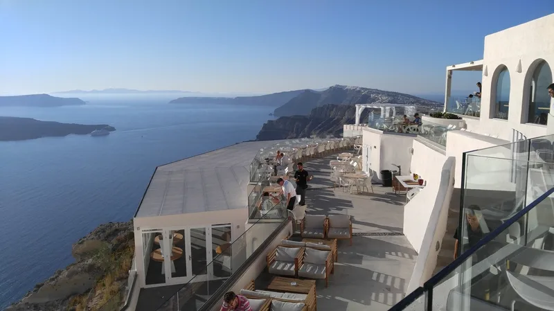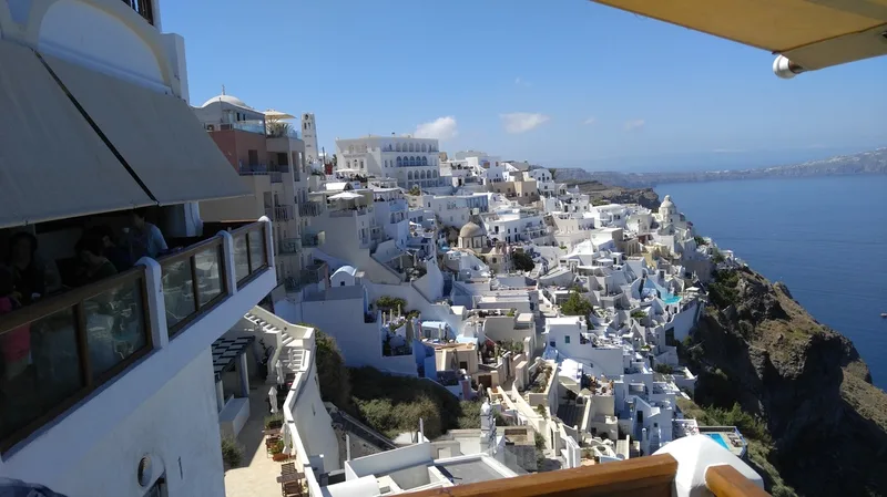 Thira (or Fira) is the capitol of the island. At the first day we travelled to Thira by bus. We took the 9:15 AM bus and half an hour later we were there, already before 10 in the morning. First thing we needed to do is to sit in one of the Terrazzos of the coffee shops there and enjoy the beautiful view from there.
